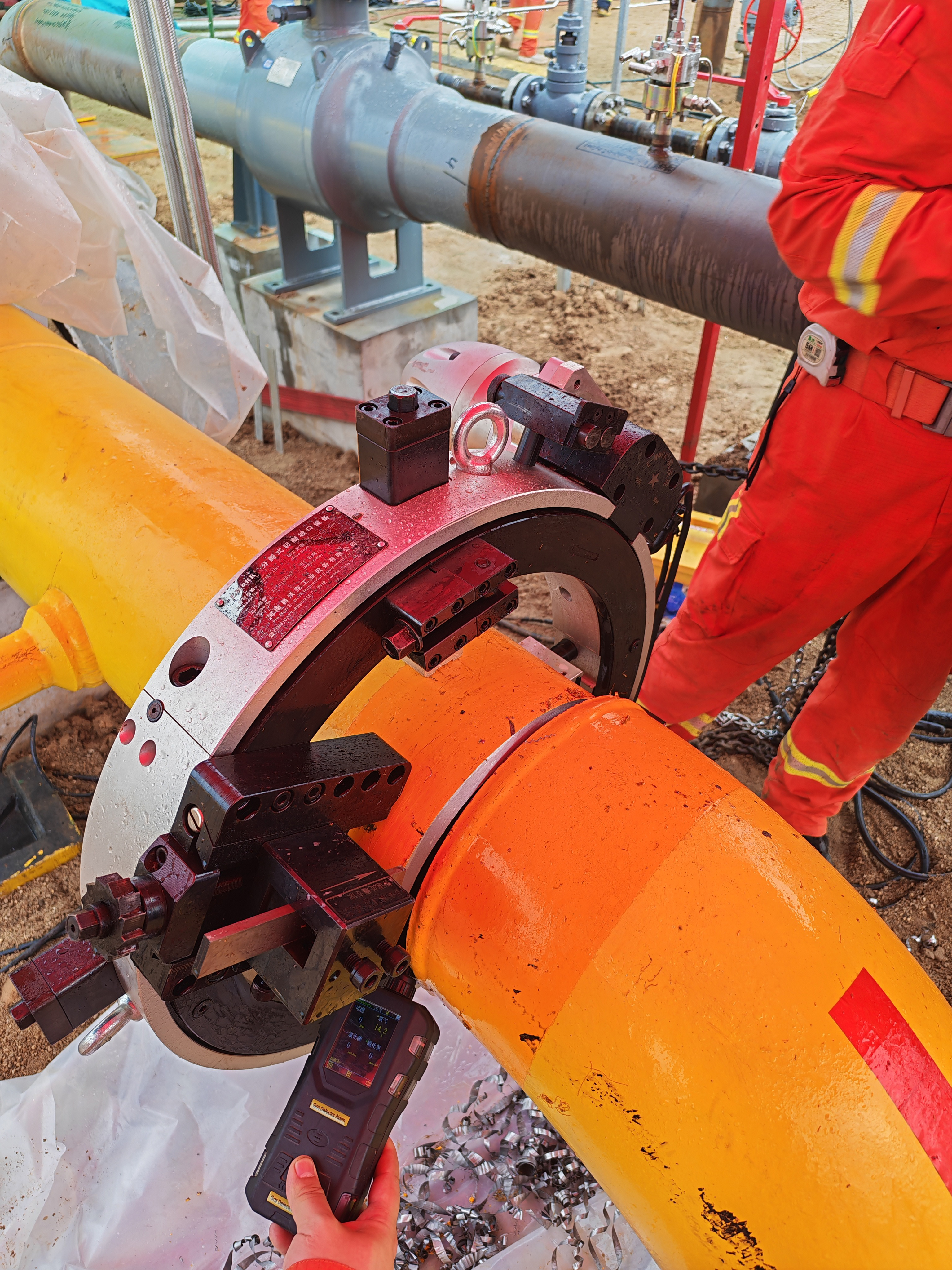 本次我司派出技術(shù)人員前往禹州分輸站進行技術(shù)指導(dǎo),現(xiàn)場氮氣置換后動火點冷切割采用分瓣式切割坡口機直接切割坡口一次完成,深受客戶的一致好評