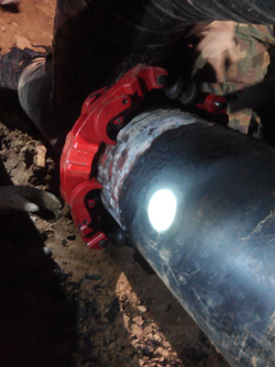 當晚,從晚上18點開挖作業坑,由煤氣公司管線所負責人籍所長現場指導工作,直至凌晨一點,閥井全部挖開。客戶采用雙向供氣模式,臨時關閉需更換閥門兩端的閥門,打開放散空放散管道余氣,去除陳舊閥門螺帽和螺栓,處理管道表面PE防腐層,切割前準備工作做好后,搶險隊同志們按照步驟安裝我司旋轉式切管機ECR12,進刀、旋轉、不停進刀,不到二十分鐘時間把DN300鋼管順利切斷,整個切割過程實現了無火花,斷口筆直、無碎屑,更省力,使切開后的管道余氣自然排放,避免了動火切割帶來的潛在危險。 隨后,搶維修隊的隊員們按照計劃更換閥門,直至凌晨六點鐘搶維修工作才圓滿結束。事后,晉中煤氣公司管線所長及搶維修隊對我司管道冷切割工具給予很高評價,同時,能為幫助客戶解決問題,我們感到尤為的榮幸,這標志著我司產品質量受到客戶的認可與肯定!