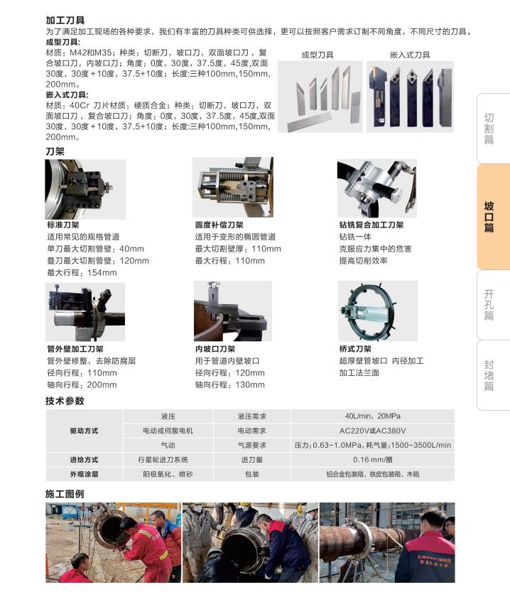◎ 可調(diào)節(jié)切割機(jī)構(gòu):自主研發(fā)的可以隨著管道的大小和壁厚不同來調(diào)節(jié)不同的進(jìn)刀量,已達(dá)到現(xiàn)場(chǎng)切割效果,使得該產(chǎn)品的加工領(lǐng)域更廣泛。